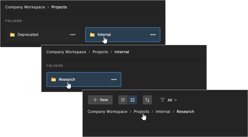 Access a folder by clicking on its name (graphical view) or double-clicking on its entry (list view). Use the breadcrumbs at the top of the view to quickly jump back up the folder hierarchy.