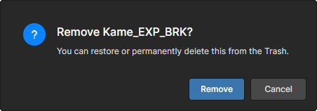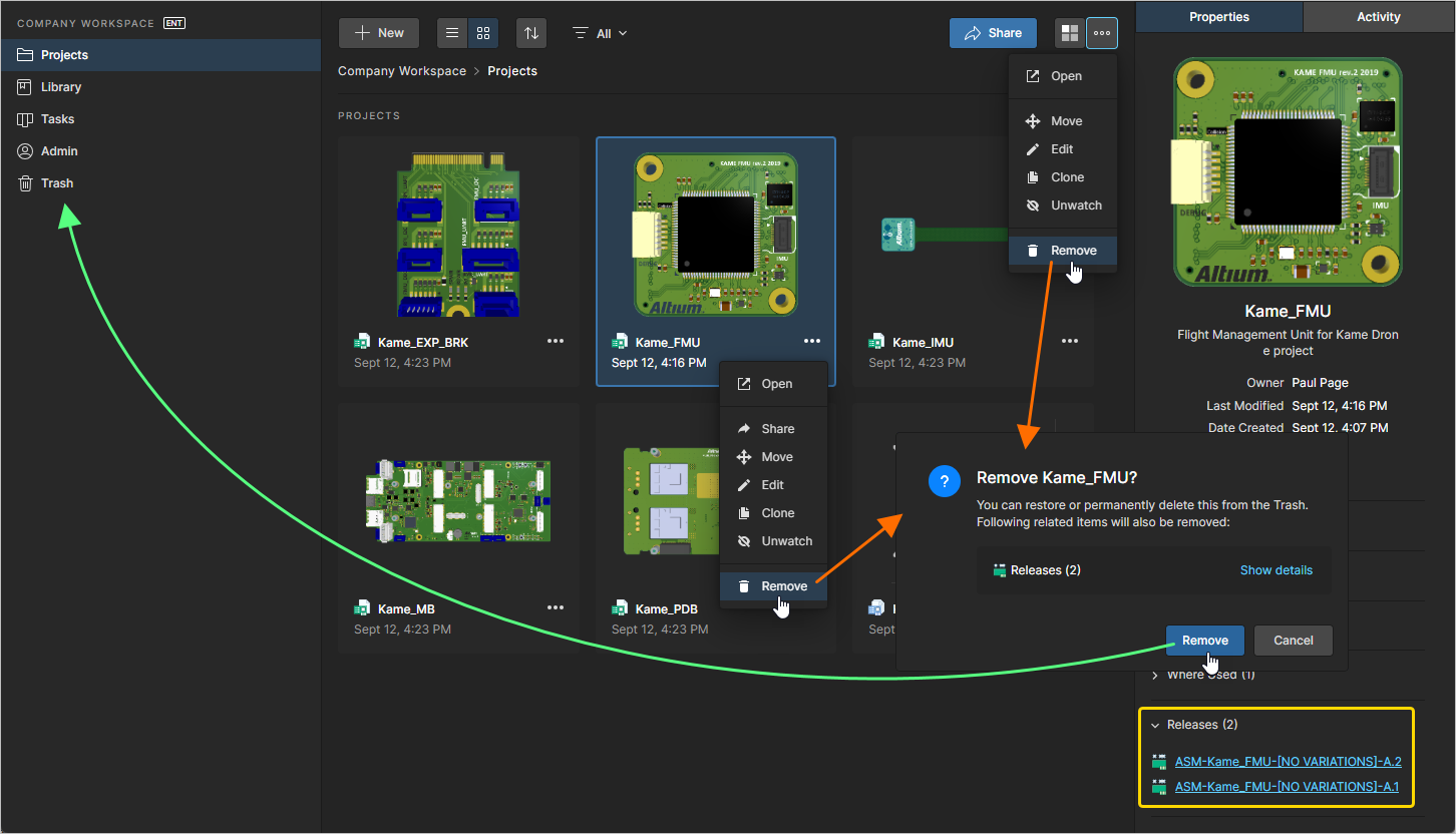 The action of removing a Workspace project is actually a 'soft delete', whereby the project and any associated Items will be moved into the Trash area of the Workspace. Confirm the removal process with the Remove <project> window's button.