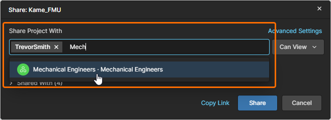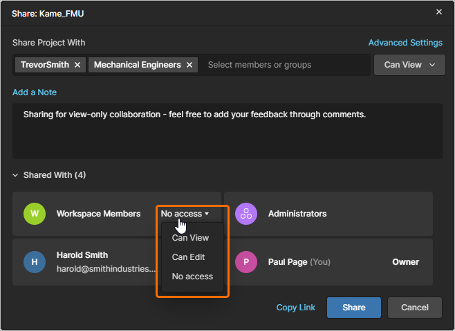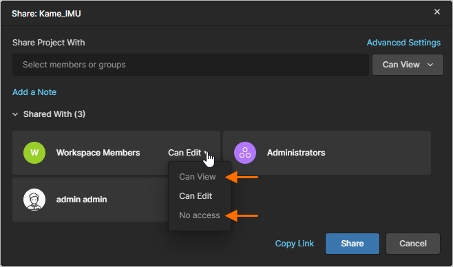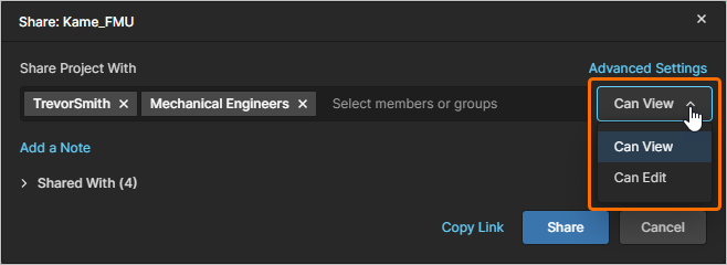 2. Set the sharing access permissions for the added users/groups from the associated drop-down menu by selecting Can View or Can Edit, where the latter option inherently includes viewing capability. The setting initially applies to all entries (user/groups) included in the Share Project With field.