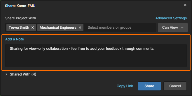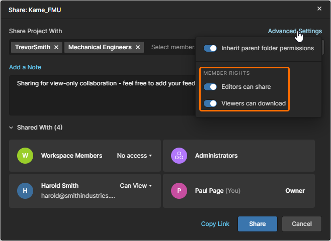 6. The Share window’s Advanced Settings include options that allow you to control who can re-share or download projects that are shared with them. The settings provide the means to specify if those granted editing rights (Can Edit) are able to share the project, and if those with read-only rights (Can View) are able to download the project.