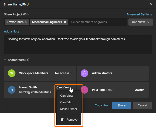 A project's Owner status and its inherent editing rights can be transferred from one Workspace member to another through the project Share window, allowing the new owner to take full control over that project. This option is available to Administrators and the current project owner, and the transfer can target other Workspace members only (but not member Groups such as Engineers or Administrators).