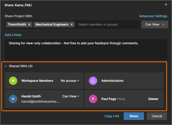 You can also share a direct link to the project. The link is obtained by clicking the control, at the bottom of the Sharing window. The link provides access based on the project's current sharing permissions. User access is determined by the Workspace Members entry permission settings (No access, Can View, Can Edit) or by the permissions applied to an explicit Share Project With entry for their name (or a Group they are a member of).