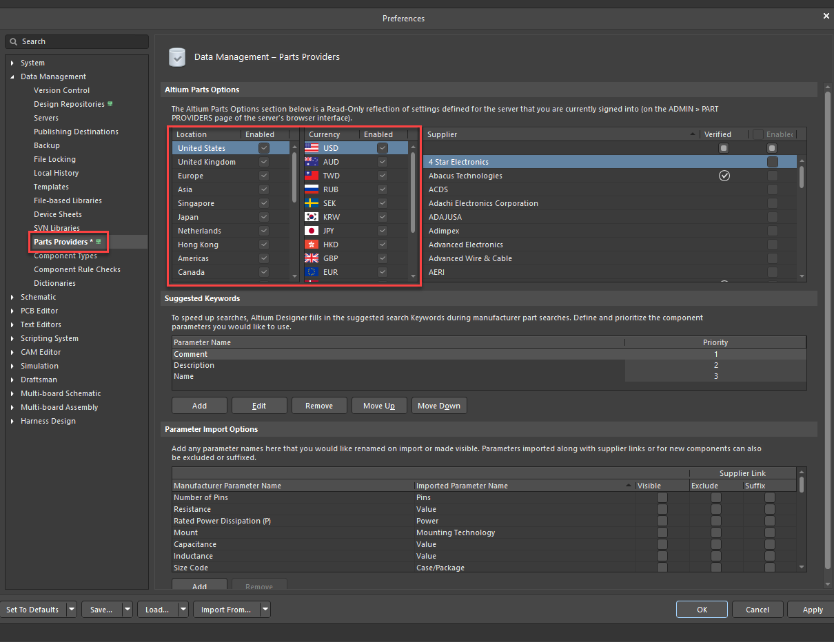 If selected Supplier Part Numbers (SPNs) in ActiveBOM show no pricing information, the issue is likely due to disabled US location or US Dollar settings in Preferences » Data Management » Parts Providers. Altium servers primarily source pricing data from US-based suppliers in USD, which is then converted to other currencies. If these settings are disabled, pricing cannot be retrieved. Enabling US location and currency settings ensures proper price data loading for SPNs.