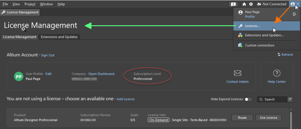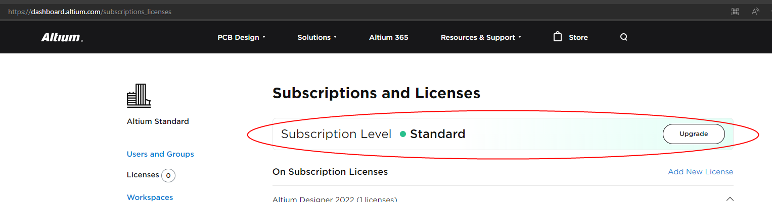 Also, on the License Management page in Altium Designer, the Subscription Level is displayed.