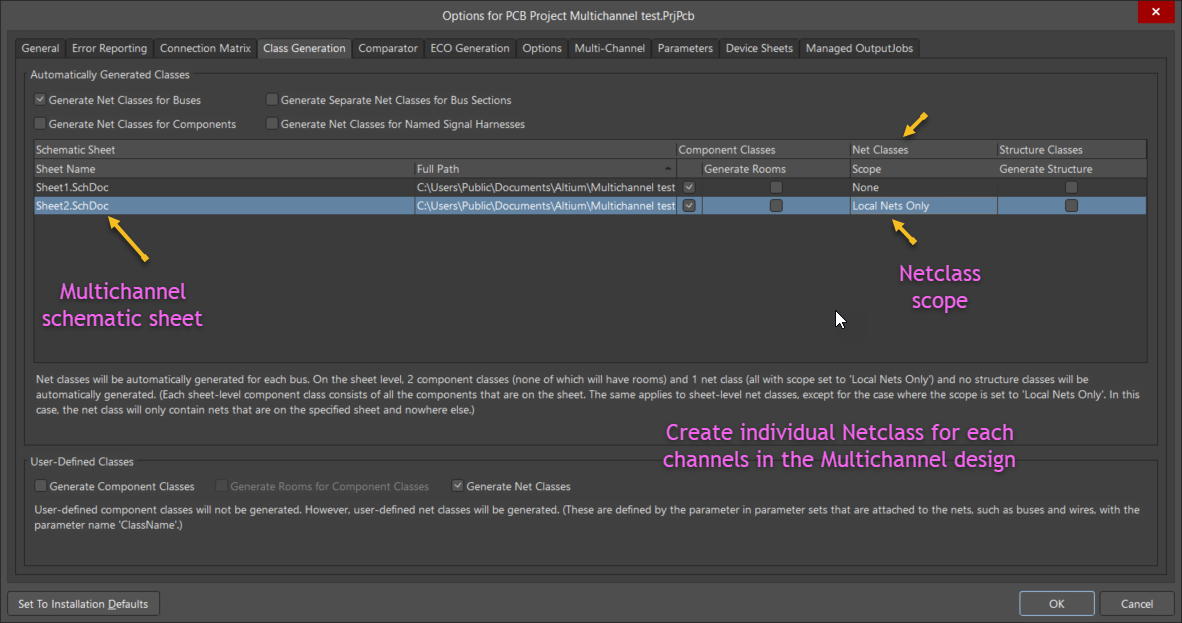 - Local Nets only โ Creates classes for nets local to each repeated sheet instance (recommended for multichannel).