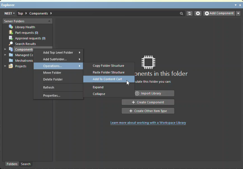 To export part numbers and component data from a Workspace Library (managed libraries stored in a connected Workspace) into an Excel-compatible format, users must follow a multi-step process using Altium Designer. This involves collecting components via the Content Cart, generating an Integrated Library (IntLib), and converting it into a Database Library (DbLib) linked to an Access database. The resulting Access file contains all component parameters in a structured format, suitable for reporting or integration with external systems.