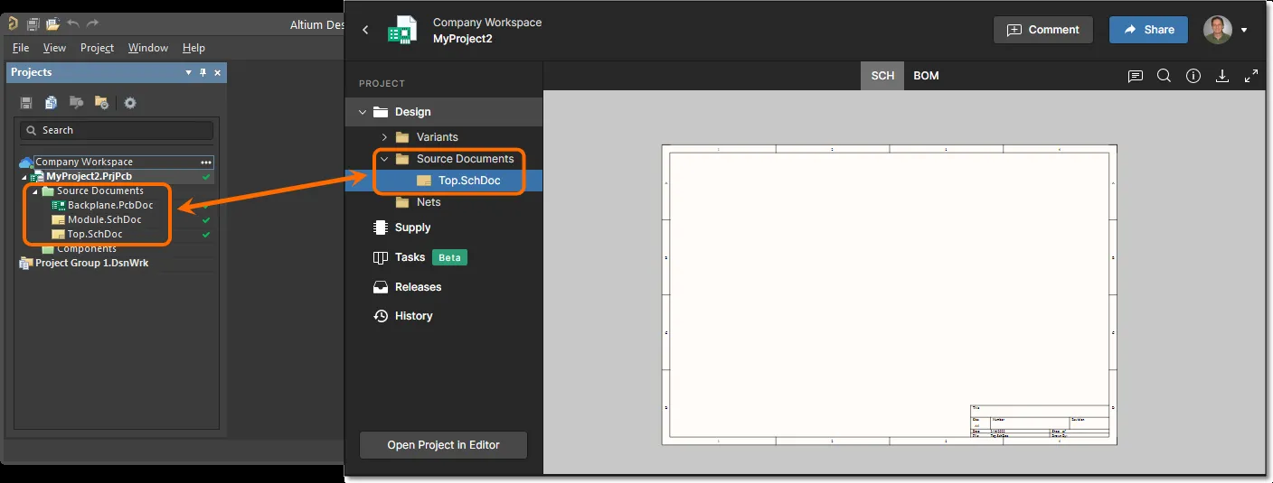 Altium Designer and the Altium 365 Workspace may display different design files when a project contains multiple project files within the same Workspace repository. This often happens if the project was saved under a new name in the same local folder and both versions were committed to the server. In such cases, the Workspace Web Viewer automatically opens the first project file in alphabetical order—along with the design files linked to it—which may not match the files Altium Designer opens locally.