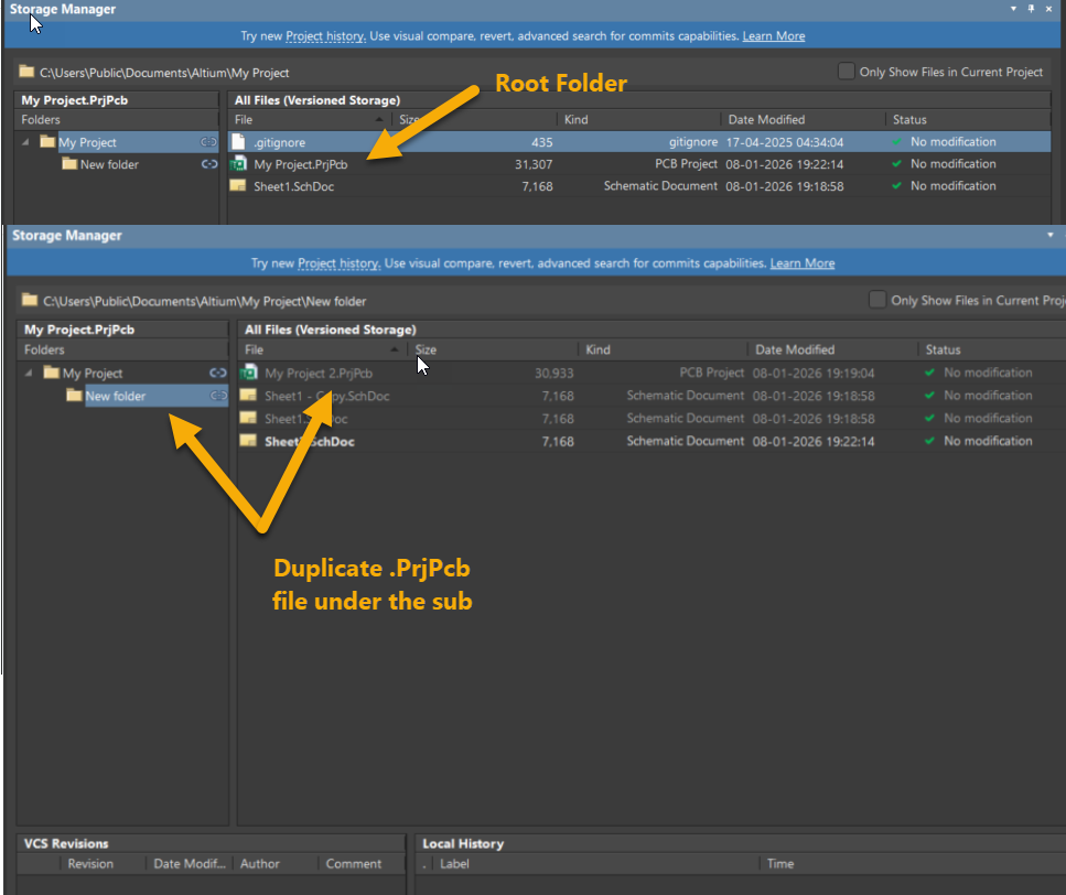 - Avoid committing external files and sub-folders to the Workspace. If committing sub-folders, expand them in the commit dialog and ensure there is no duplicate *.PrjPcb file.