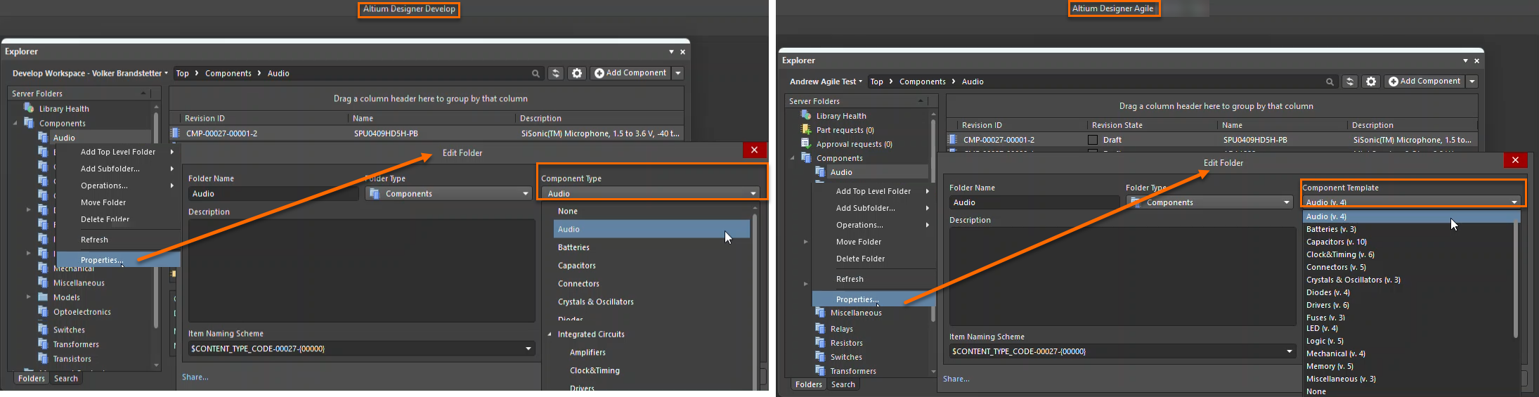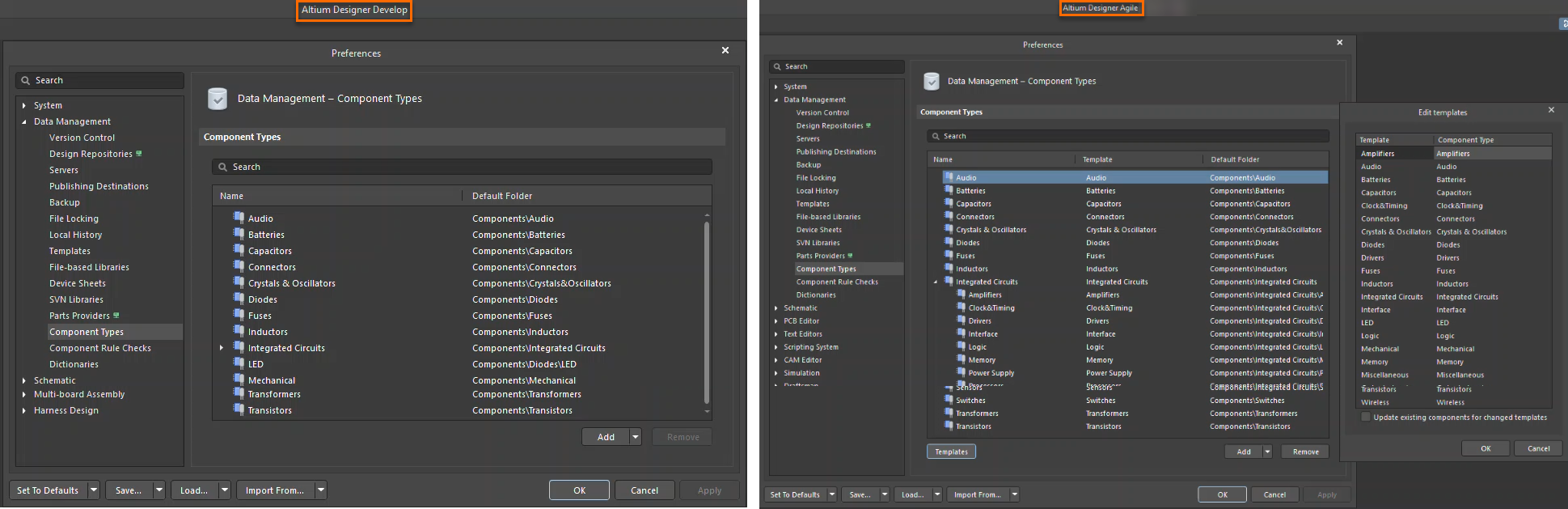 • Altium Develop does not support Component Templates, while Altium Agile (Teams or Enterprise) supports Component Templates.