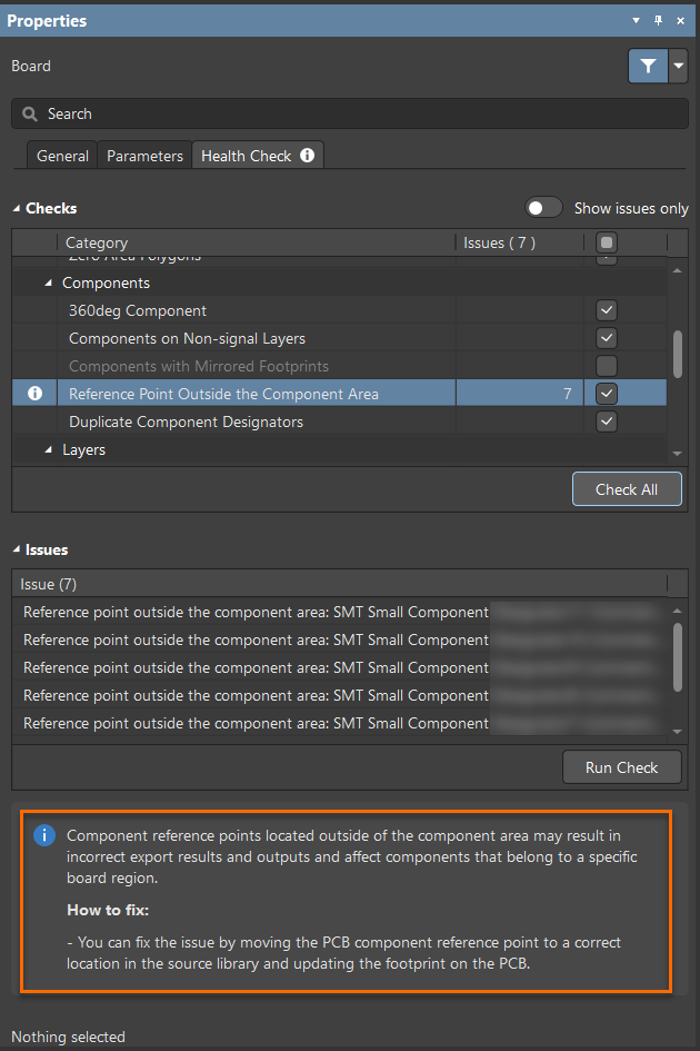 Note (as shown in the PCB Health Check Monitor panel): Component reference points located outside of the component area may result in incorrect export results and outputs and can affect components that belong to a specific board region.