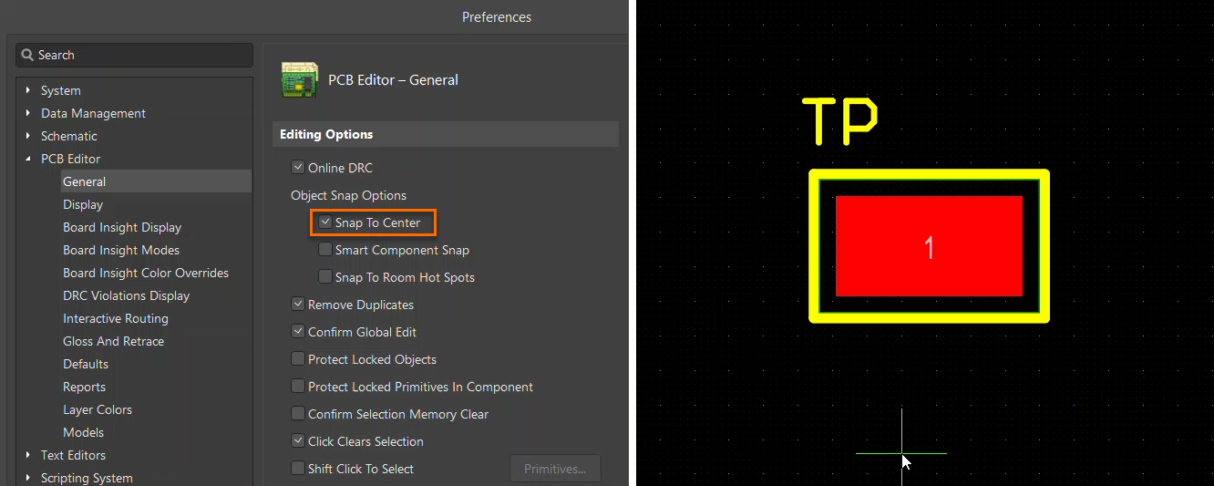 Altium Designer Preferences dialog showing PCB Editor General settings, with the “Snap To Center” option enabled, alongside a PCB view illustrating a test point and its reference location.