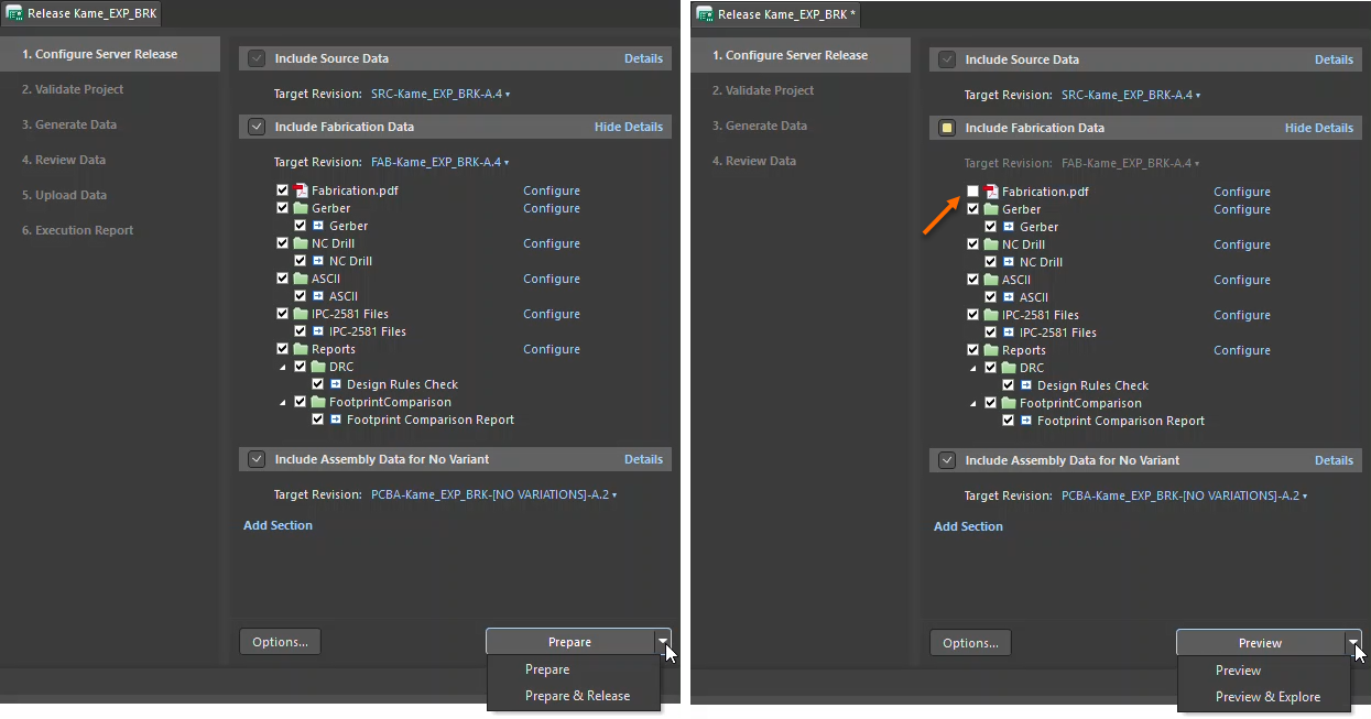 Altium’s Project Releaser requires all output documents to be selected in order to proceed with a release. If any document is deselected during the Data Review stage, the system switches to Review mode, disabling the Release button and preventing completion. This behavior ensures that only complete manufacturing data packages are released. To exclude specific outputs, users must modify the OutJob file prior to initiating the release process.
