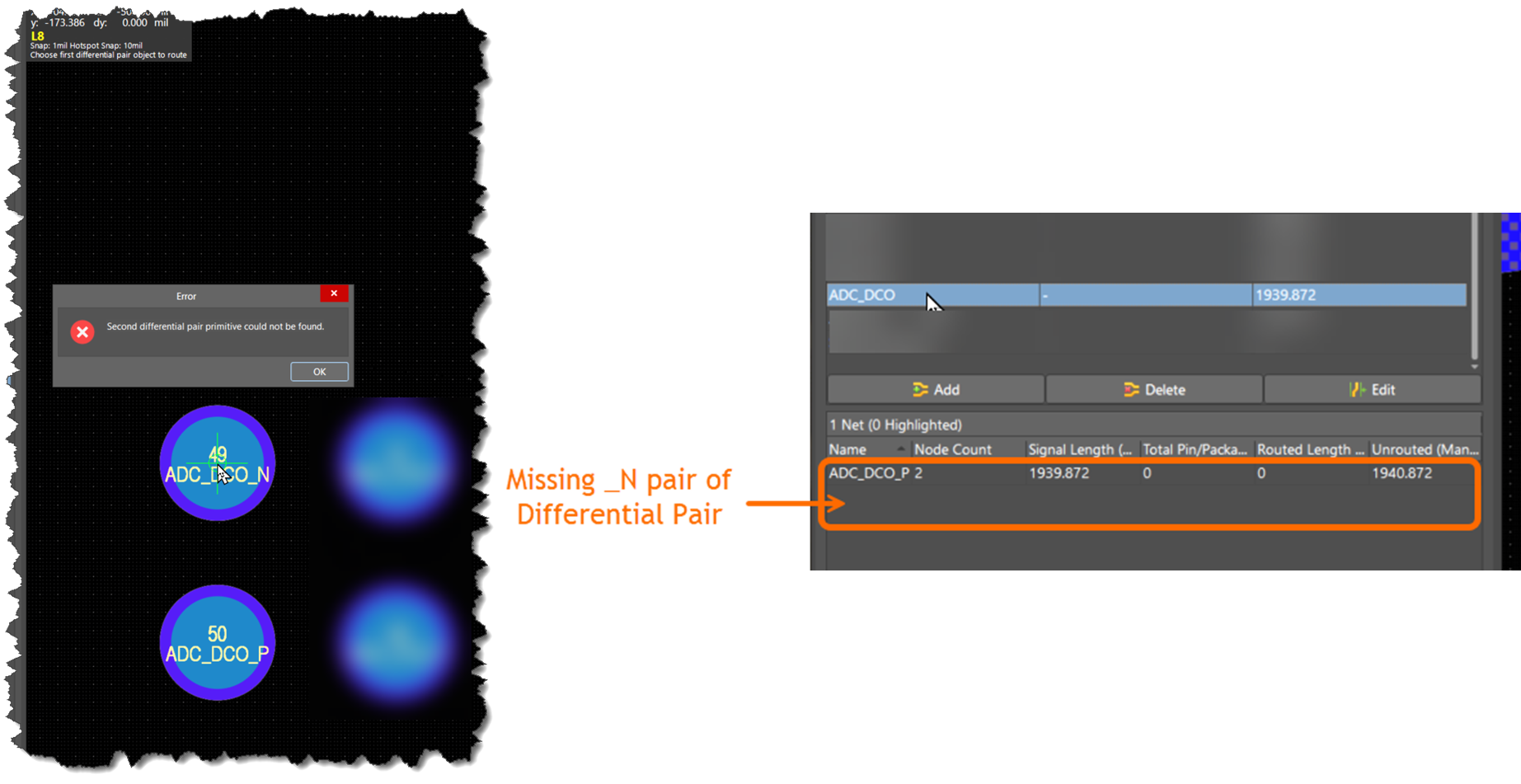 Error when an attempt is made to route the differential pair. PCB panel showing the missing Negative Net for the defined Differential pair