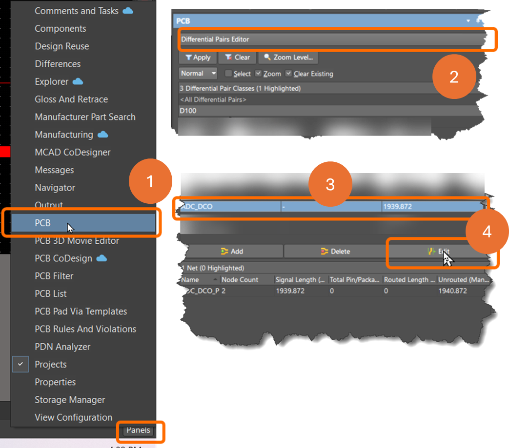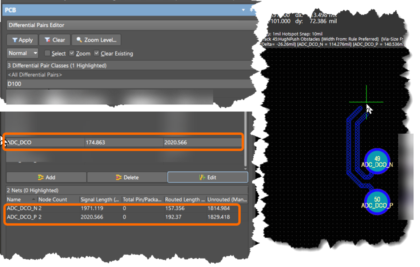 Editing the affected differential pair in the PCB panel