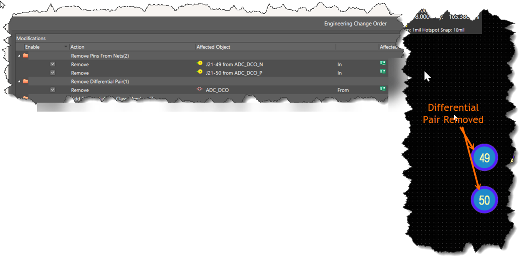 Update the PCB using the ECO process and and confirm that affected differential pairs have been deleted on the PCB