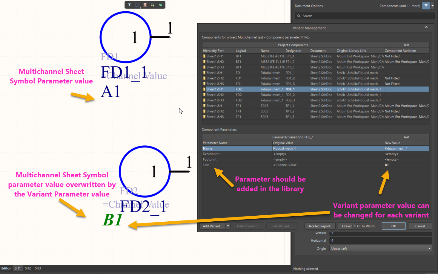 In multi-channel designs, there are situations where additional component parameters must have different values for each repeated channel instance. By default, when a custom parameter is added directly to a component in a repeated channel, that parameter value is shared across all repeated instances, which makes it unsuitable for cases where each channel requires a unique value. This article outlines methods for independent parameter values using sheet symbol parameters and variant configurations.