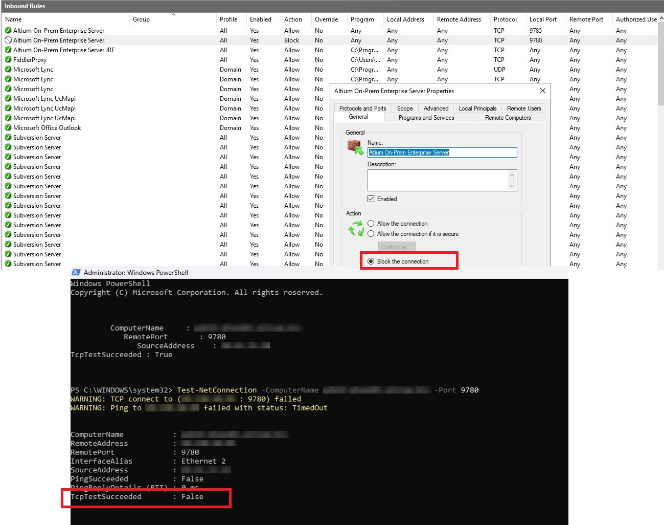 To ensure secure communication and guarantee that all traffic is transmitted over HTTPS, a firewall should be configured on the machine where the Altium Server is hosted. This configuration must block inbound connections from client machines attempting to access the server via http://<FullServerComputerName:9780>.