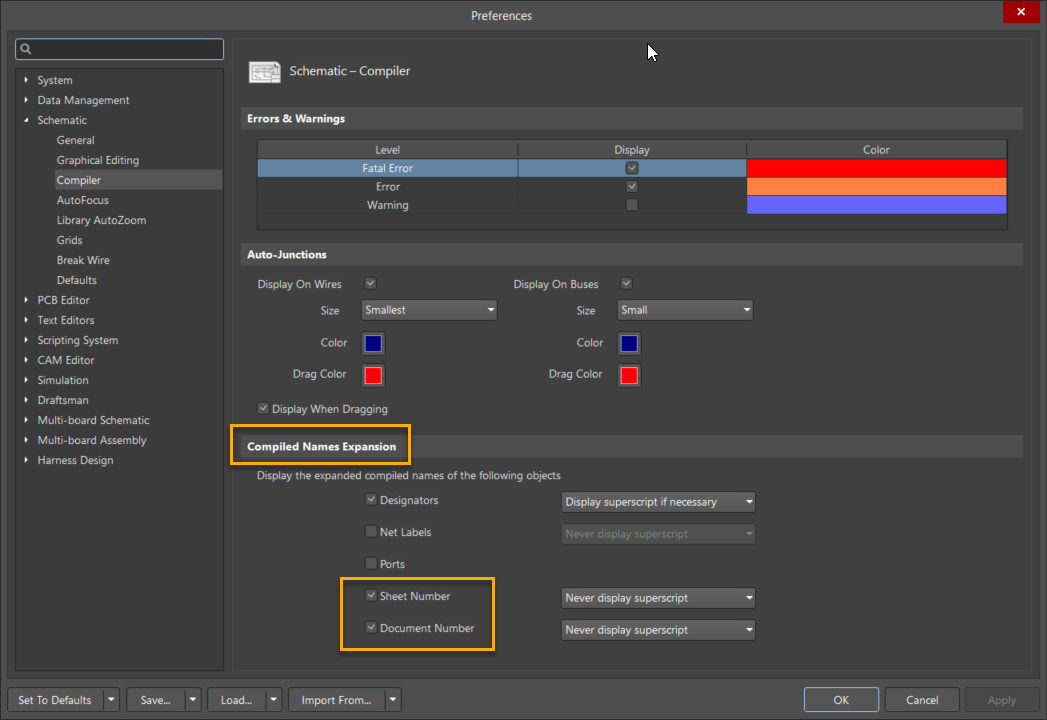 - Go to Tools » Preferences » Schematic Editor » Compiler » Compiled Name Expansion.