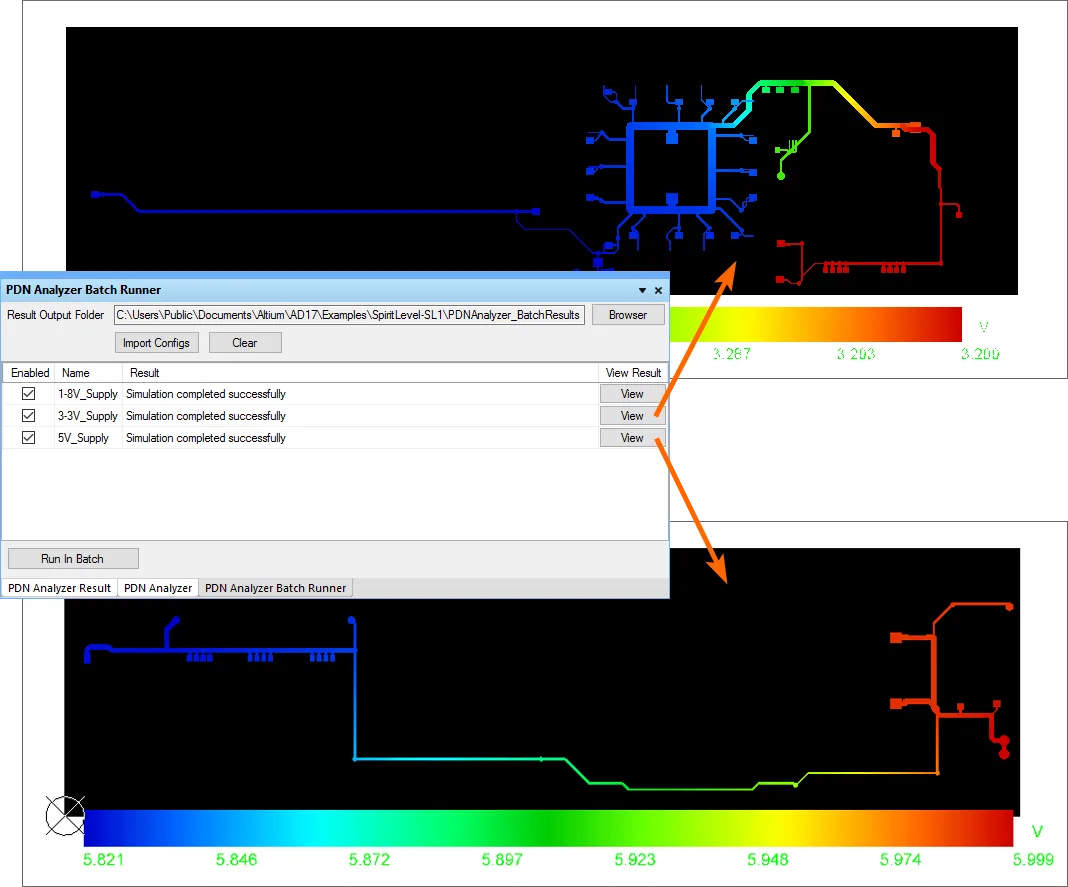 The results for each PDN simulation are saved in individual subfolders named as the associated configuration, and therefore can be recalled by the PDN Analyzer as required. To view a particular simulation result (or a collection of past batch simulation results) in a subsequent session, add the configuration files again in the panel’s PDN Analyzer Batch Runner tab. Those that have been previously run will be indicated by the Simulation completed successfully entry in the Result column. Alternatively, repeating the Run In Batch command will overwrite the existing results.