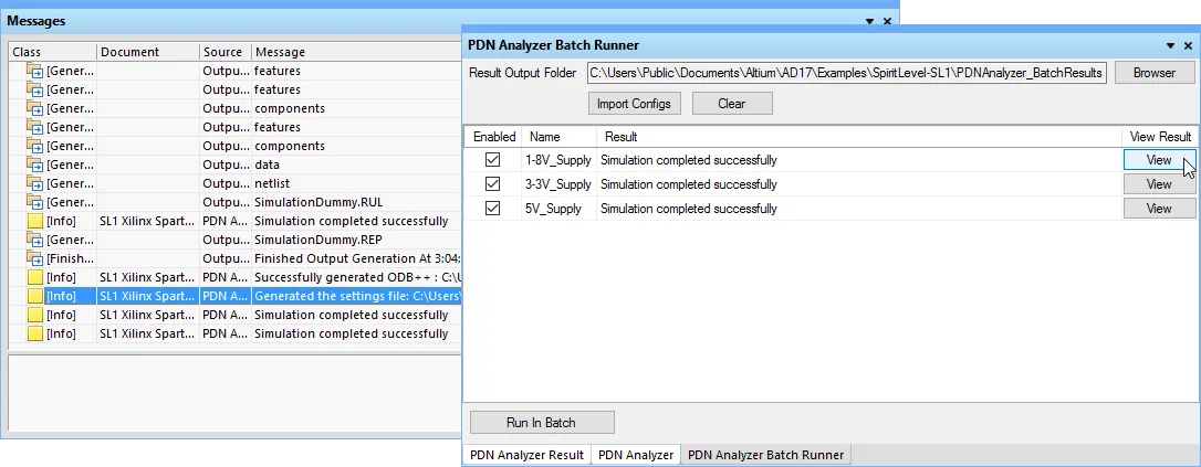 A successful sequence of PDN analyzer simulations is indicated by confirmation entries in Altium Designer’s Messages panel and the panel’s Result column (as shown above). Use an entry’s