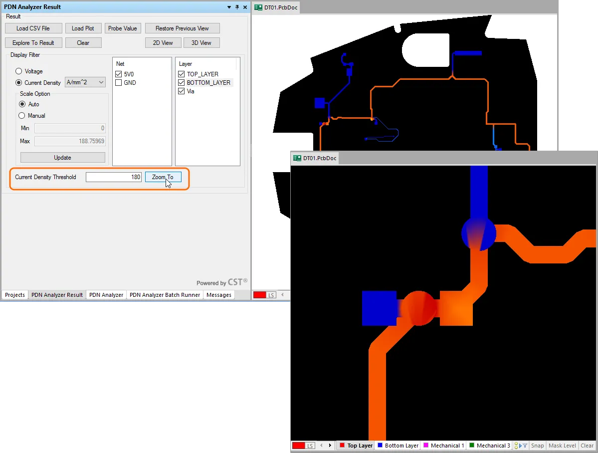 An additional High Current Density Threshold field is now available in the panel’s PND Analyzer Result mode view. The value entered in this field acts as a defined point at which the current density level in the board shapes should not exceed, and therefore acts a current density design constraint for the board layout.