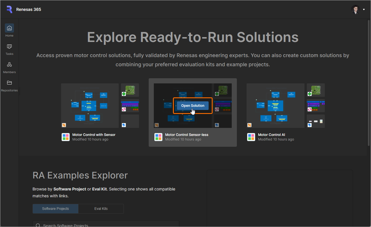 en la región Get Started With Renesas 365 para abrir la página Explore Ready-to-Run Solutions (si hay soluciones en el Workspace, primero haga clic en el control Show More para expandir la región Get Started With Renesas 365).