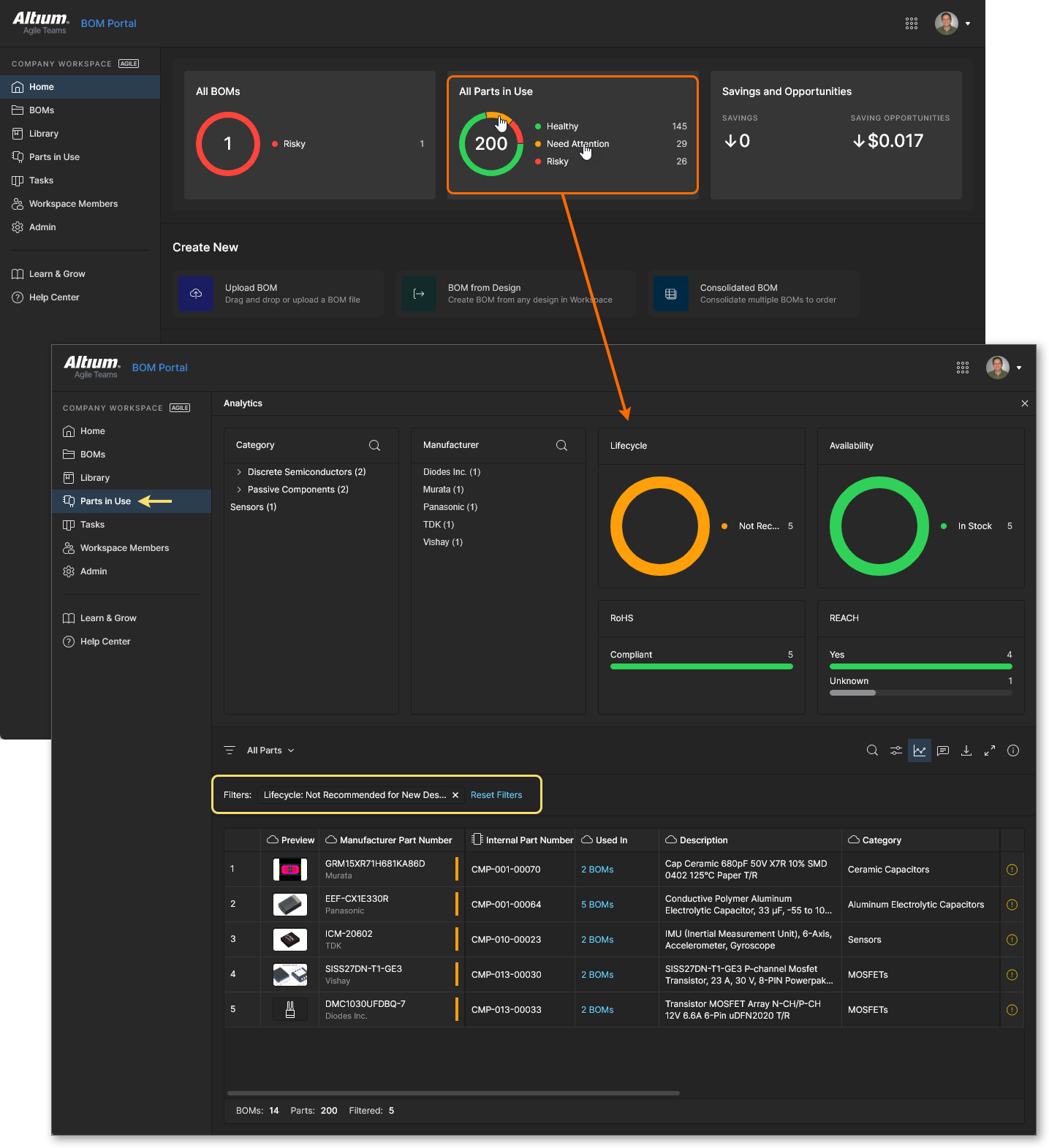 The BOM Portal’s Parts in Use page provides a detailed listing of the component parts used in all of the Workspace's Projects and Managed BOMs. The aggregated view includes column data to identify each used component (MFR, MPN, etc), its Library ID/IPN (where applicable), the BOM/Project files in which it is used, its component Type category, and all other BOM-related health, supplier and compliance details. The listing also features interactive part Analytics, advanced sorting and filtering, and the ability to create and recall curated Part Report Views.