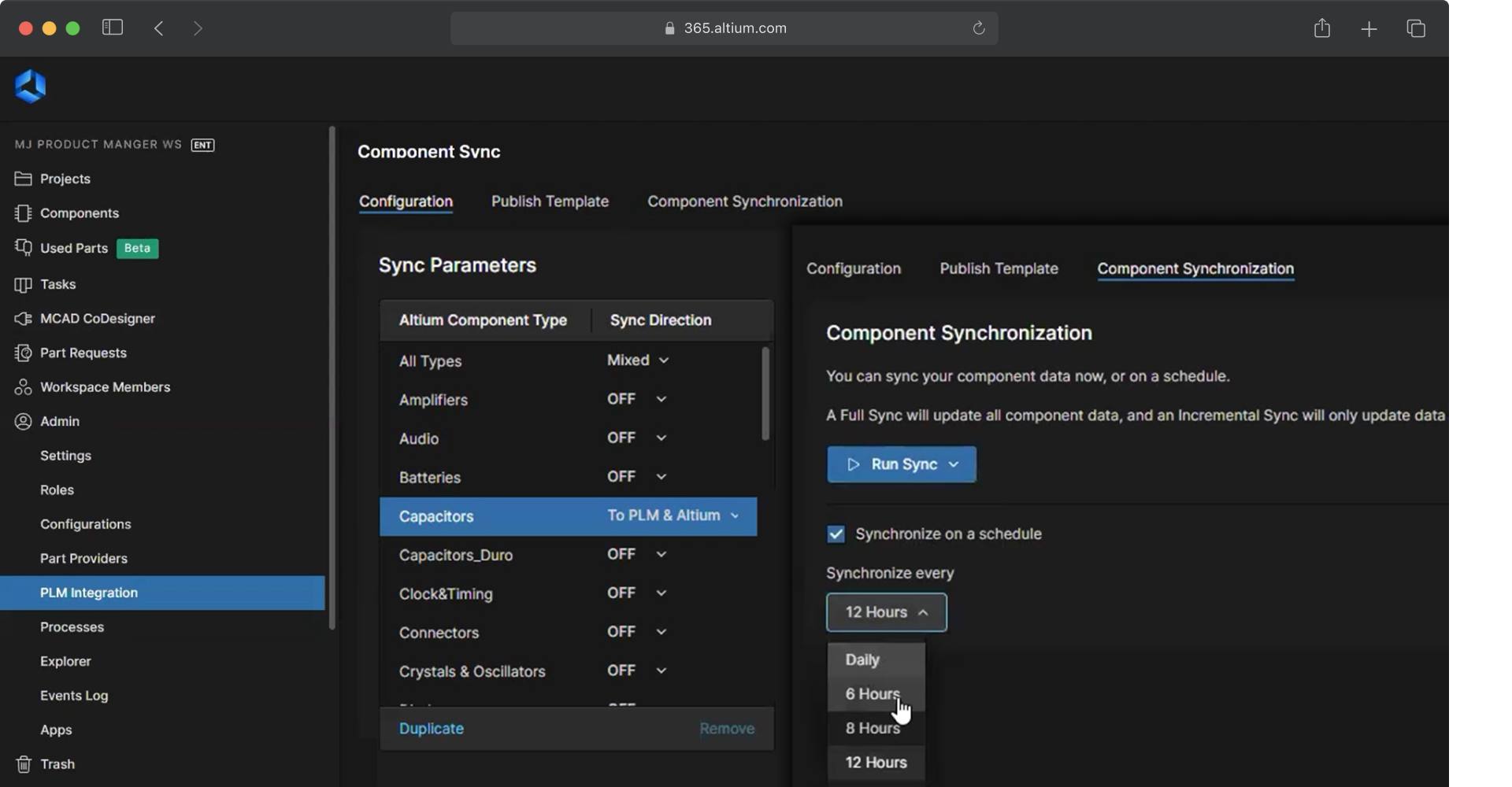 Altium 365 offers bidirectional data synchronization with major PLM systems, enabling seamless data flow between design and business processes. Altium 365 synchronizes components, component parameters, and design data between the design environment and PLM systems, including Windchill, Arena, and Duro.