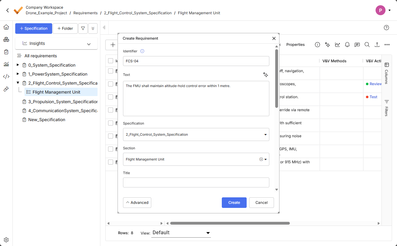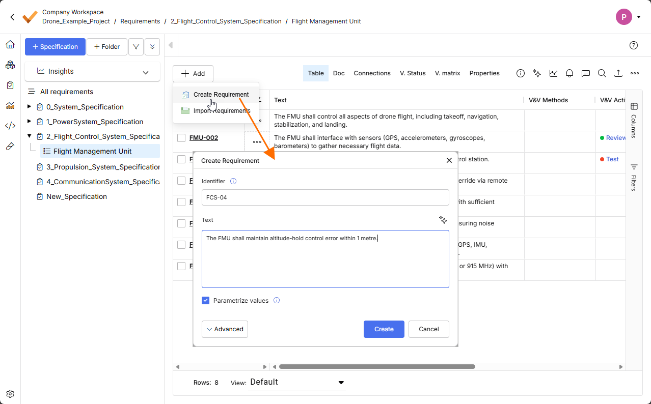 button at the bottom of the window to access other fields, using which you can specify additional details such as the Specification and the Section that the requirement will belong to. Furthermore, you can check on possible Values + Units (Valis) that can be transformed into parameters (by enabling the Parametrize values option) before creating the requirement.