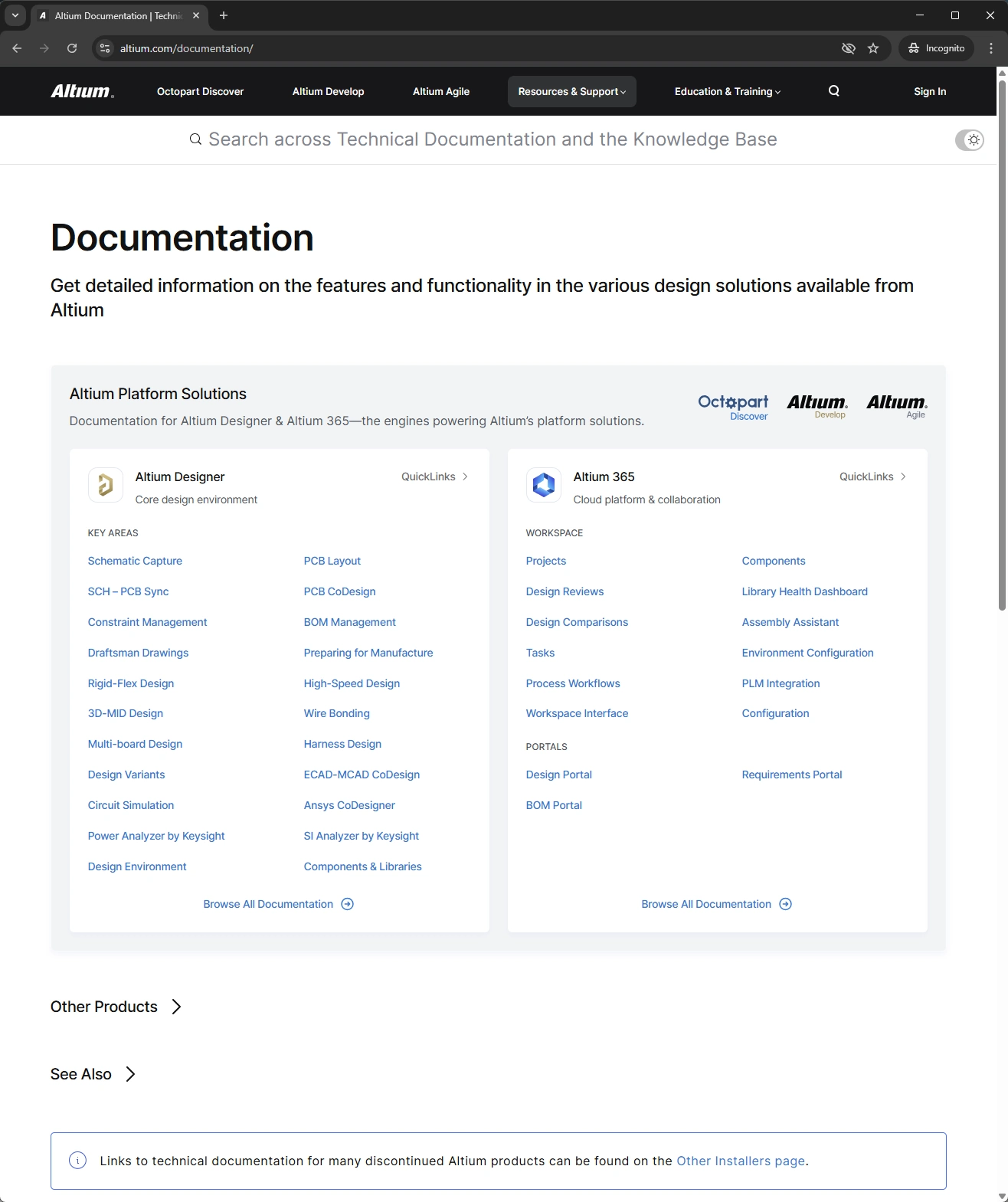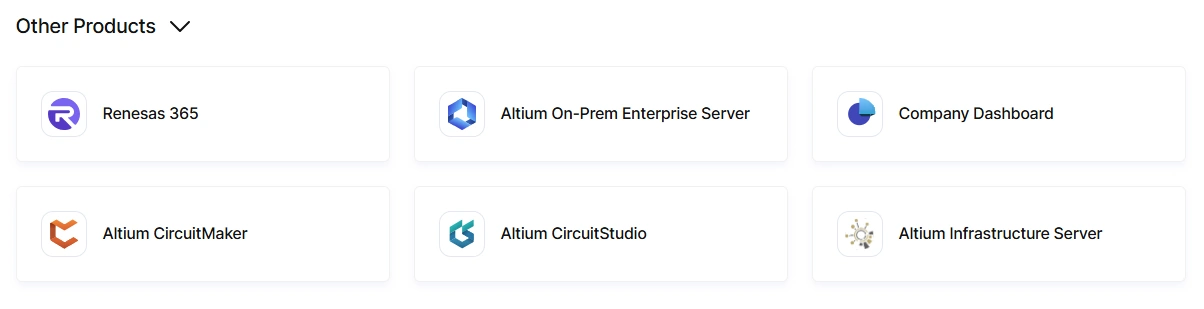 Click on the Other Products entry to expand the page to access documentation for other solutions/areas: Renesas 365, Altium On-Prem Enterprise Server, Company Dashboard, Altium CircuitMaker, Altium CircuitStudio, and Altium Infrastructure Server.