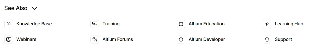 Click on the See Also entry to expand the page to access other useful resources Altium has to offer, such as the Knowledge Base, the Learning Hub (full of interesting and focused articles, many written by industry experts), Altium Professional Training, and the Altium Forums (an invaluable learning resource with information directly from your peers).