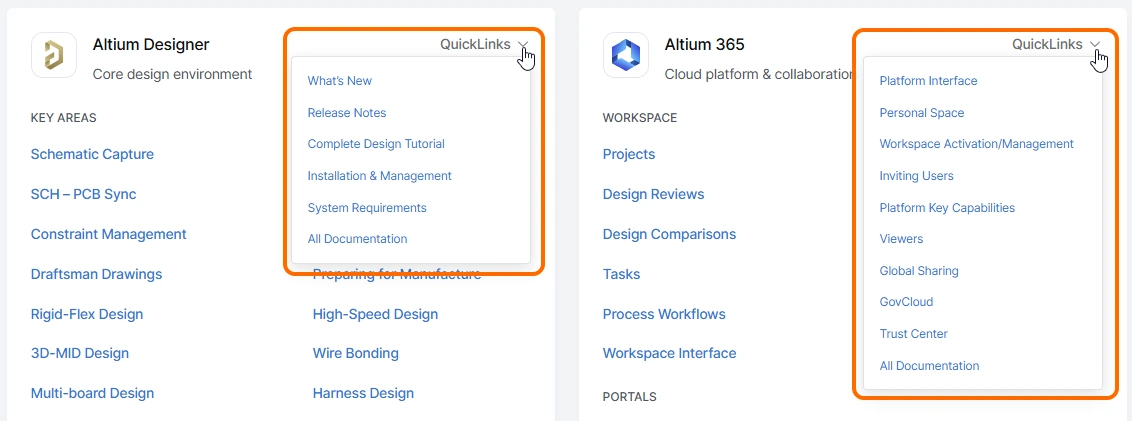 Use the available QuickLinks menus to access additional key paging, as shown below for the Altium Designer and Altium 365 documentation tiles.