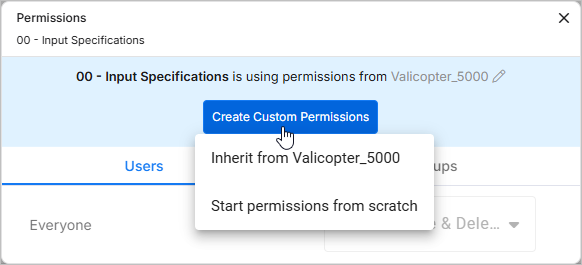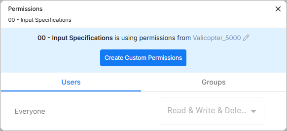 開いた Permissions ウィンドウで、現在移動しているオブジェクトの権限を設定できます。ウィンドウ上部には、権限を設定する対象オブジェクト名が表示されます(以下の例では 00 - Input Specifications という名前の specification)。また、カスタム権限が追加されていない場合に、どのオブジェクトから権限を継承しているかも確認できます。この場合、00 - Input Specifications は Valicopter_5000 プロジェクトから権限を継承しています。