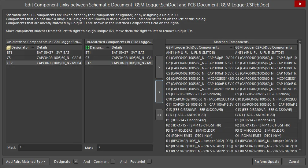 Matched Components - この領域には、現在一致しているすべてのコンポーネントが表示されます。領域内の2列には、左に回路図コンポーネント、右にPCBコンポーネントが表示され、各エントリはデジグネータ、フットプリント名、コメントで構成されます。