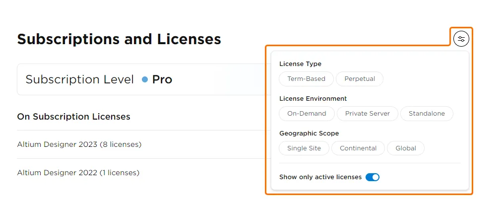 会社ダッシュボードのLicensesページでは、現在必要なライセンスのみをページに表示するためのフィルタリングを適用できるようになりました。Subscriptions and Licensesのヘッダーの右にある