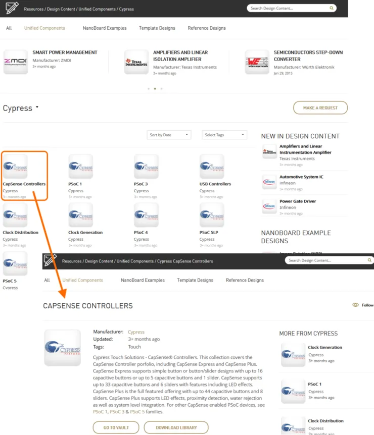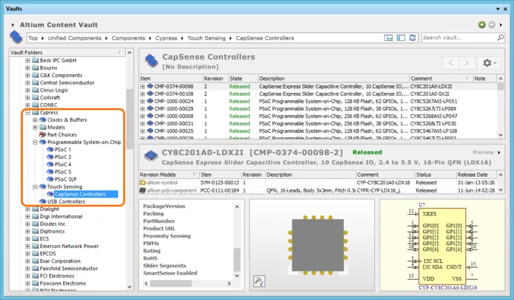 これらのコントローラは、Altium Web サイトの Design Content / Unified Components の項目内の Cypress CapSense Controllers や PSoC ページ (PSoC 1, PSoC 3, PSoC 4, PSoC 5, PSoC 5LP) にあります。