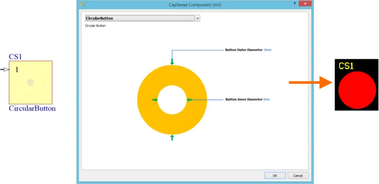 ボタンセンサーを利用するために、CircularButton コンポーネントを使用します。これは、Cypress PSoC コントローラへ直接、接続するための1チャンネルの自己静電容量、zero-dimensional センサーです。PCB でのセンサーパターンは、丸形の電極です。