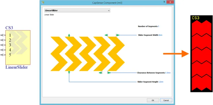 n-segment リニアスライダーセンサーを利用するために、LinearSlider コンポーネントを使用します。これは、Cypress PSoC コントローラ(パターンの各セグメントは、コントローラの各ピンへ接続します)へ直接、接続するための自己静電容量、one-dimensional センサーです。PCB でのセンサーパターンは、1xn 列の 2 つの chevron 形状の電極から成ります(n は、指定したセグメント数です)。隣接して n 個に分割されているセンサーパターンです。センサーの高さと幅や、センサー間の隙間をコントロールできます。