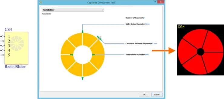 n-segment ラジアルスライダーセンサーを利用するために、RadialSlider コンポーネントを使用します。これは、Cypress PSoC コントローラ(パターンの各セグメントは、コントローラの各ピンへ接続します)へ直接、接続するための自己静電容量、one-dimensional センサーです。PCB でのセンサーパターンは、n 個のくさび形状の電極から成ります(n は、指定したセグメント数です)。放射状に隣接して、n 個に分割されているセンサーパターンです。スライダーの内部、外部の直径や、隣接するセグメント間のクリアランスをコントロールできます。