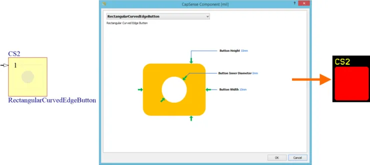 ボタンセンサーを利用するために、RectangularCurvedEdgeButton コンポーネントを使用します。これは、Cypress PSoC コントローラへ直接、接続するための1チャンネルの自己静電容量、zero-dimensional センサーです。PCB でのセンサーパターンは、丸形四角形の電極です。