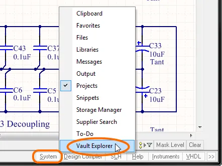 Vault Explorer パネルを表示するには、Altium Designer の右下にある System ボタンをクリックし Vault Explorer を選択します。あるいは、View » Workspace Panels » System サブメニューからそのパネルを表示できます。