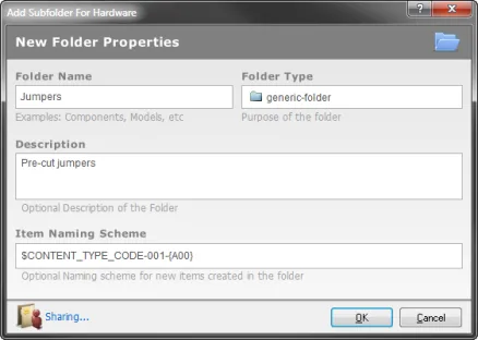 Item Naming Scheme – この欄は、フォルダ内で作成した Item の固有の ID を素早く定義するために使用できるデフォルトの割り付け方針です。デフォルトの割り付け方針を使用して、ソフトウェアは自動で次の固有の ID を割り当てます(その方針に基づいて、Vault や既存の Item の識別子を検索して)。以下の割り付け方針は、content、またはフォルダタイプに依存して 3 段階の識別子で利用できます: