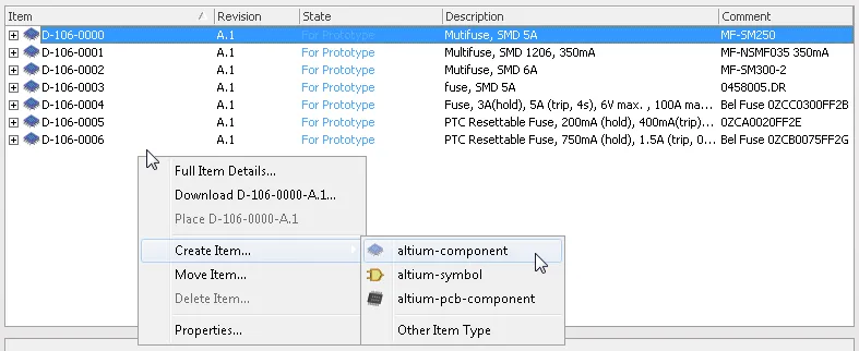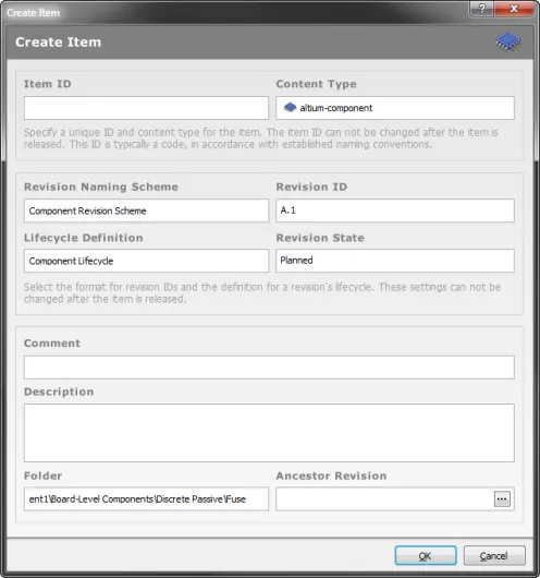 Different Item は、異なるタイプのリリースデータを保存したり表現するために使用します。ある Item は回路図シンボルや PCB コンポーネントモデルを表し、他の Item はソースデザインと、リリースされたボードデザイン configuration から生成したデータを含みます。Item (正確に言うと、そのレビジョン)は、その Item を作成、または編集している時に指定する必要がある Content Type 属性を含めるために使用します(content のタイプを宣言します)。これを行うには、Item Type を指定します。