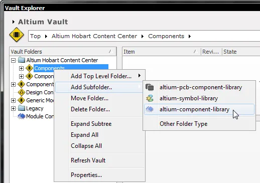 vault に保存される各 entity は Item と呼ばれます。Item を更新するために、vault に保存されるものは一連の Item Revision(その Item の特定のレビジョンで、その名称は選択した Revision Naming Scheme に基づきます)です。各新しい Item はフォルダ内に作成されます。vault 内でフォルダを定義したら、パネルの Item 領域にある選択したフォルダに新しい Item を作成できます。