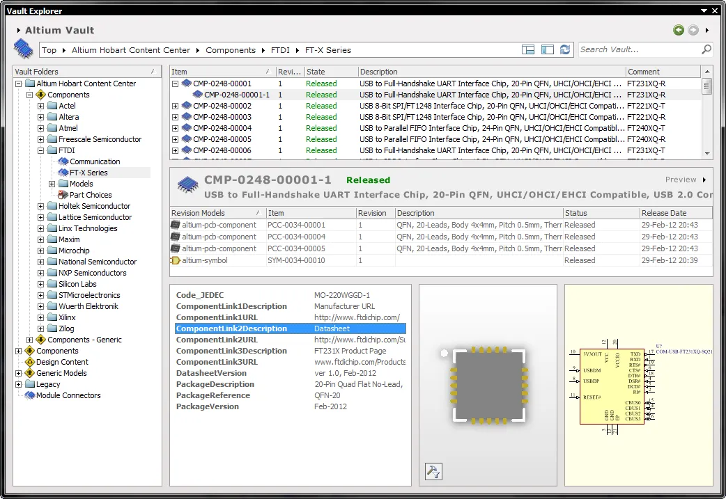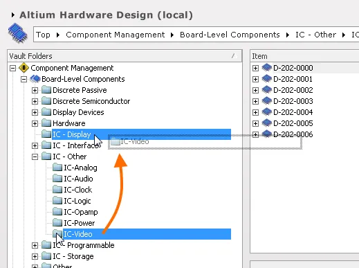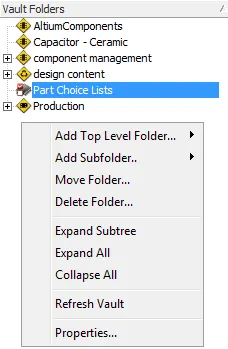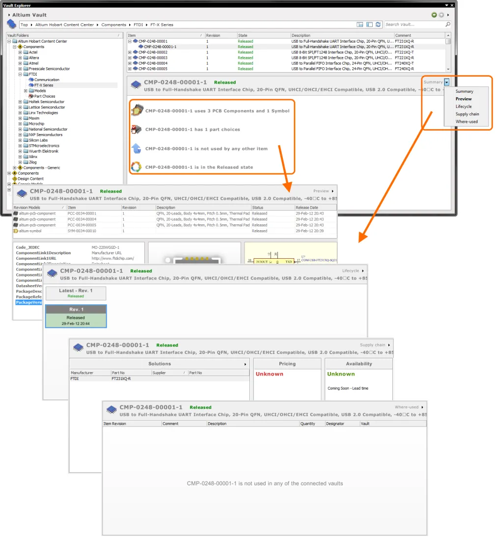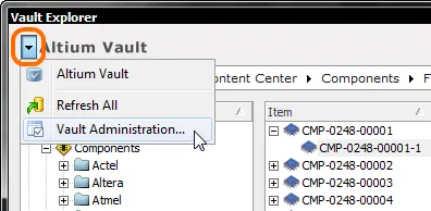 Vault Explorer パネルは、Altium Designer と接続した Altium Vault 間の最初のインターフェース(設計データ管理システムに不可欠な)です。Altium Vault には、コンポーネント、管理されたシートやテンプレート、完成したデザインを含む会社の設計データを保存します。Vault Explorer パネルから、vault で使用した組織の構造を作成、管理して多くの Item (設計側のオブジェクト)を作成できます。また、詳細な Item 情報を表示でき、そこで Item の revision や lifecycle 設定を管理します。また、Where Used and Supply Chain の詳細を表示できます。