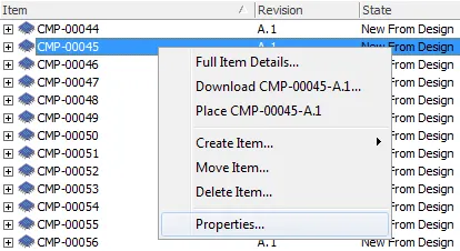 - Properties – Item Properties ダイアログを表示するには、このコマンドを使用します。ここで、選択した Item の属性を表示できます。Item のレビジョンがまだリリースされていない場合、属性を修正できます。