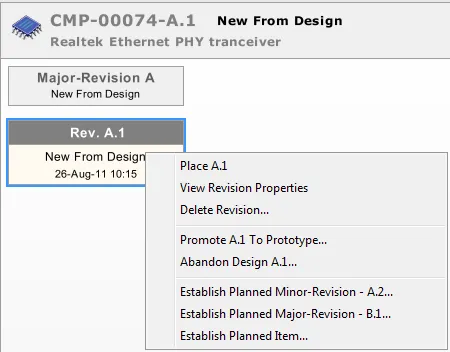 New From Design状態にあり、デフォルトのStructured Lifecycle With Approvalsライフサイクル定義に従って 2 つのコマンド(Set Ready for Prototype ApprovalとAbandon Design)が表示されます。 - Establish Planned Revision – 3-level revision naming scheme (例えば、