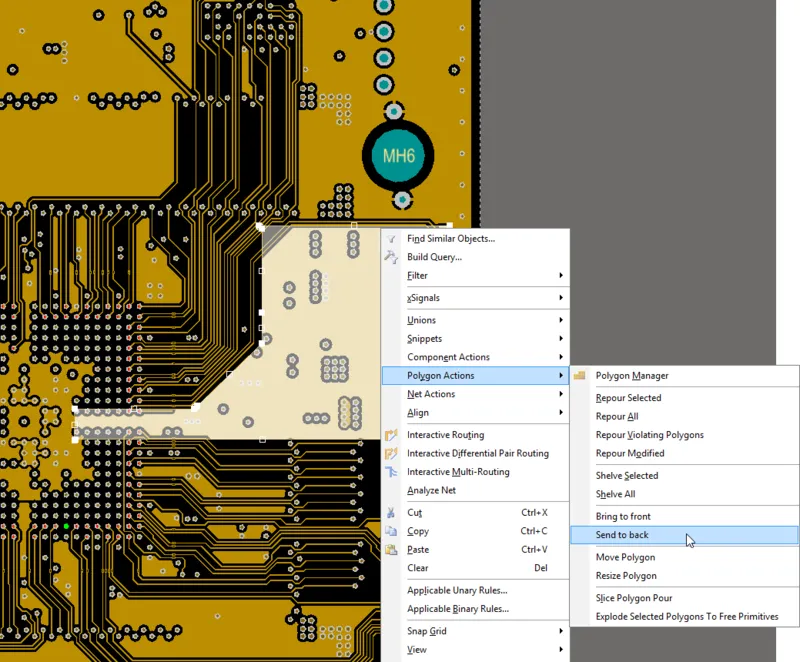 Always repour polygons on modification(Preferences ダイアログの PCB Editor - General ページ)を有効にして、ポリゴンを自動で再構築できます。このオプションを有効にした場合、編集後にポリゴンのセレクトを解除(ワークスペースの何も無い個所でクリック)すると、ポリゴンとそれに依存するポリゴンは、再構築されます。