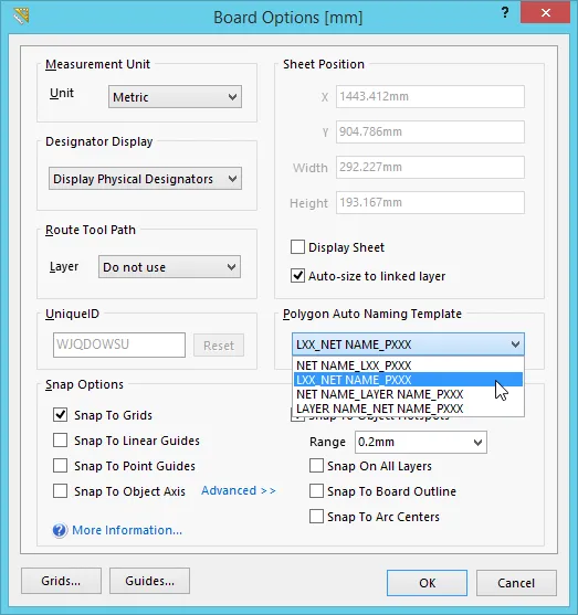 ポリゴンにどのような名称を付けるか(テンプレート)は、Board Options ダイアログの Polygon Auto Naming Template で選択します。