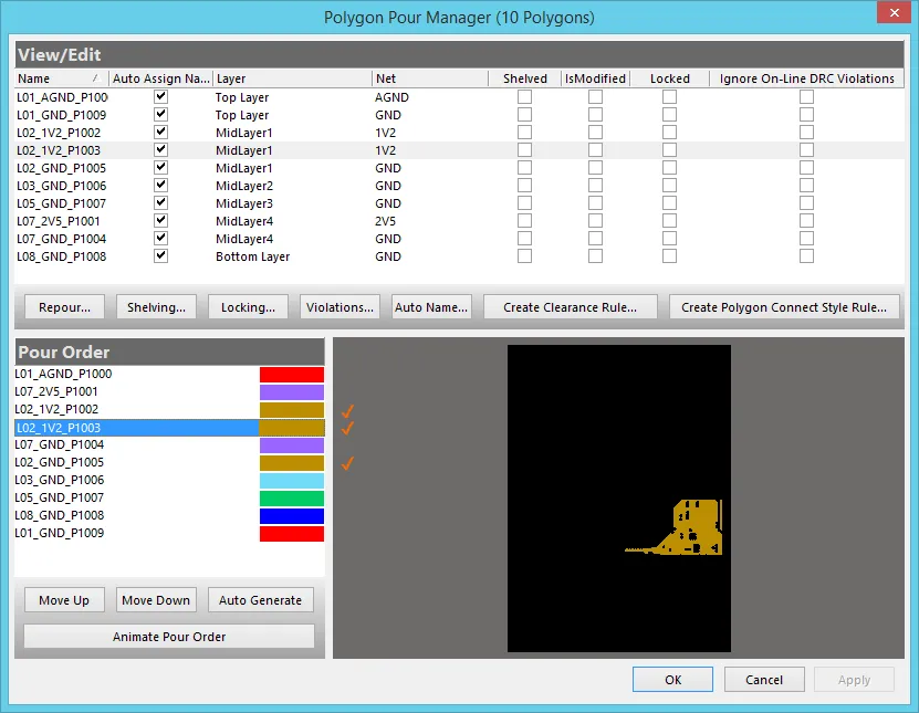 構築順は、Polygon Pour Manager で管理できます。ここでは、MidLayer1 に 3 つのポリゴンがあり、現在、選択したポリゴンは、2 番目に構築されます。